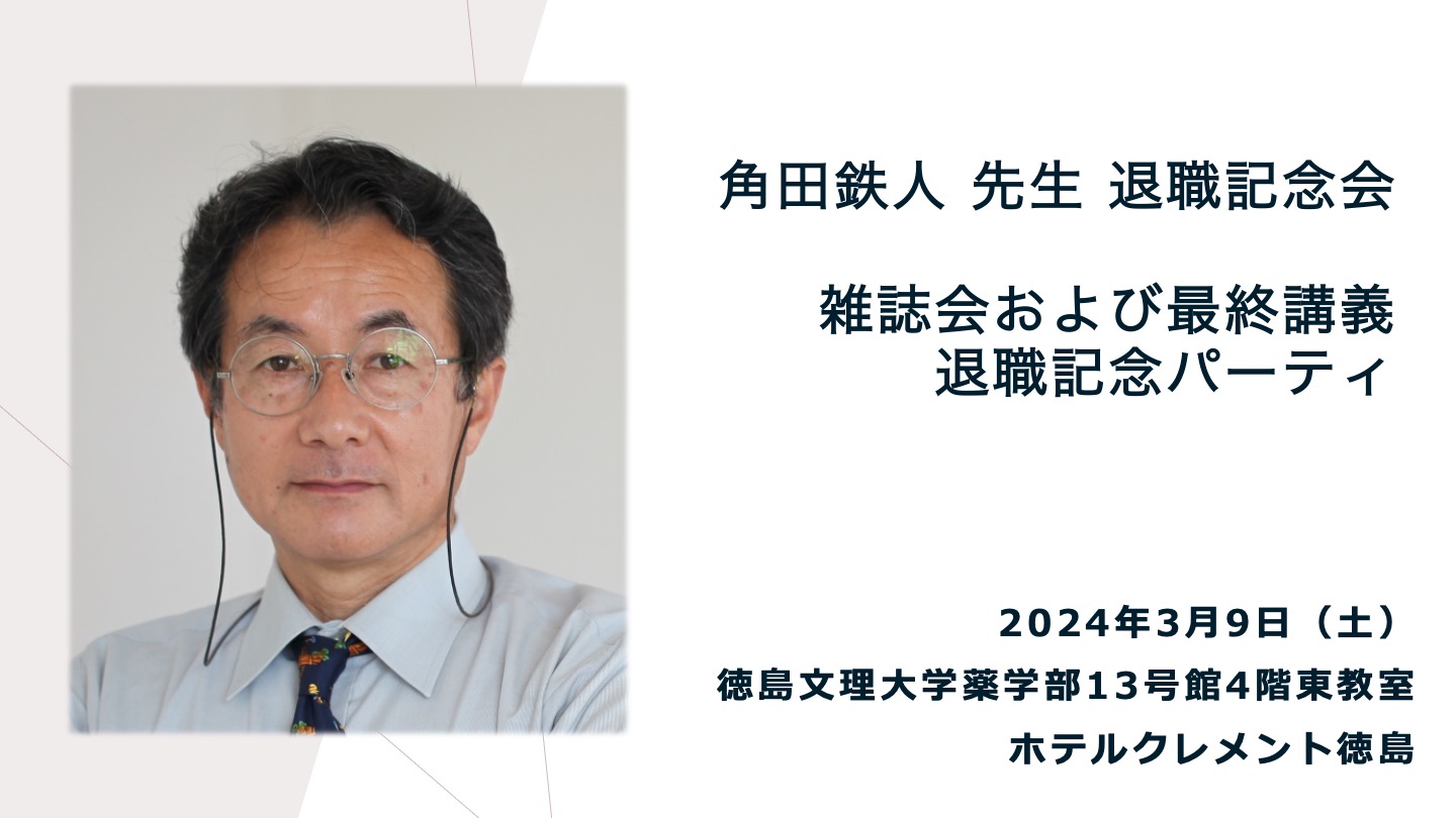 徳島文理大学薬学部伊東研・角田研同窓会主催「角田先生退職記念会」を2024年3月9日(土) 徳島文理大学薬学部/ホテルクレメント徳島にて開催します。